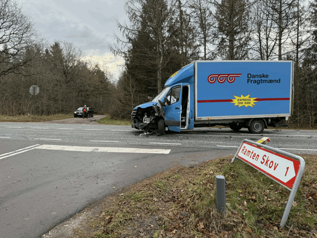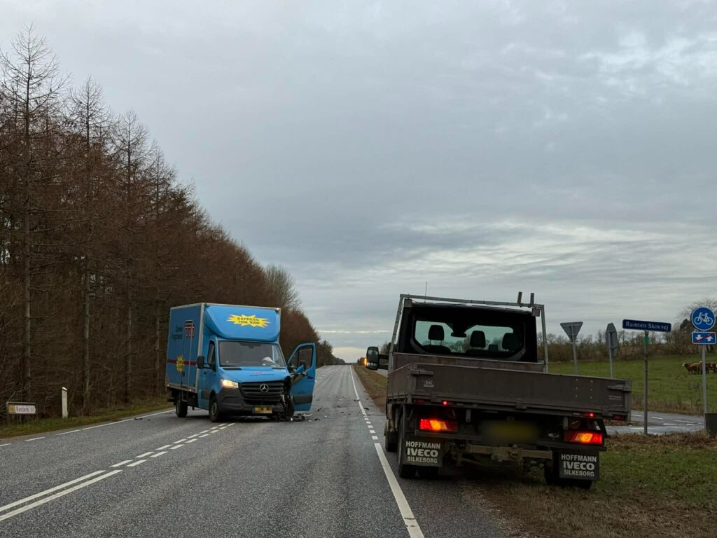 En varebil med lift og en personbil er tirsdag formiddag kollideret ved et kryds på en hovedvej. Flere udrykningskøretøjer er blevet rekvireret til området, fortæller et vidne.
