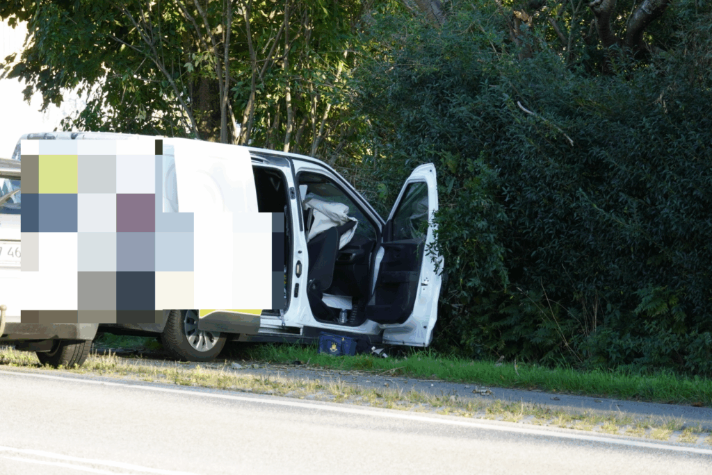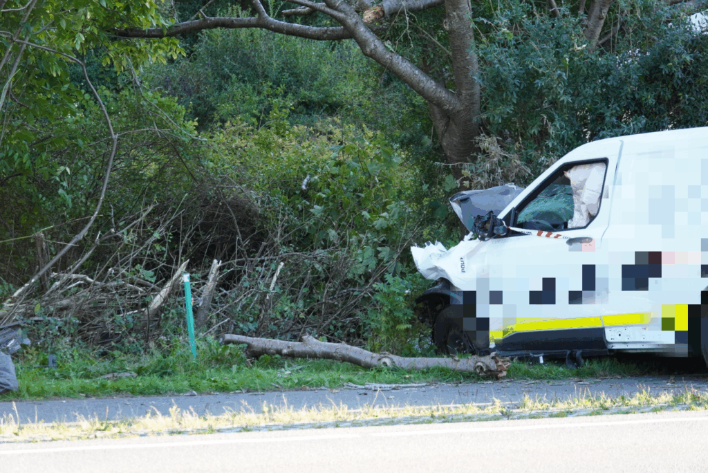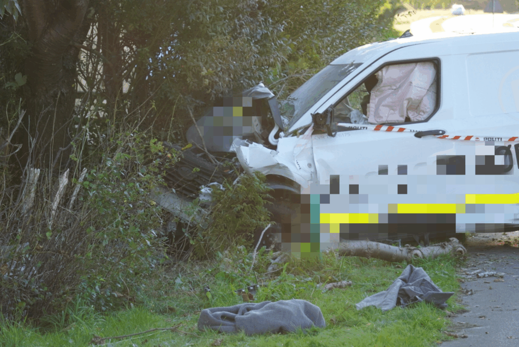 Billeder fra stedet viser, hvordan varevognen har smadret ind i et træ, og køretøjets front har lidt stor skade.
