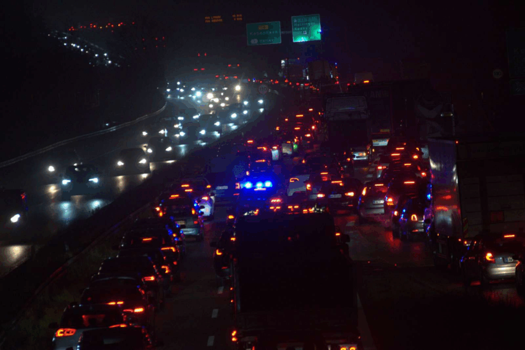 Imens bevæger morgentrafikken sig kun langsomt væk fra området, hvor patruljer arbejder på at sikre vejen og skabe overblik over situationen.