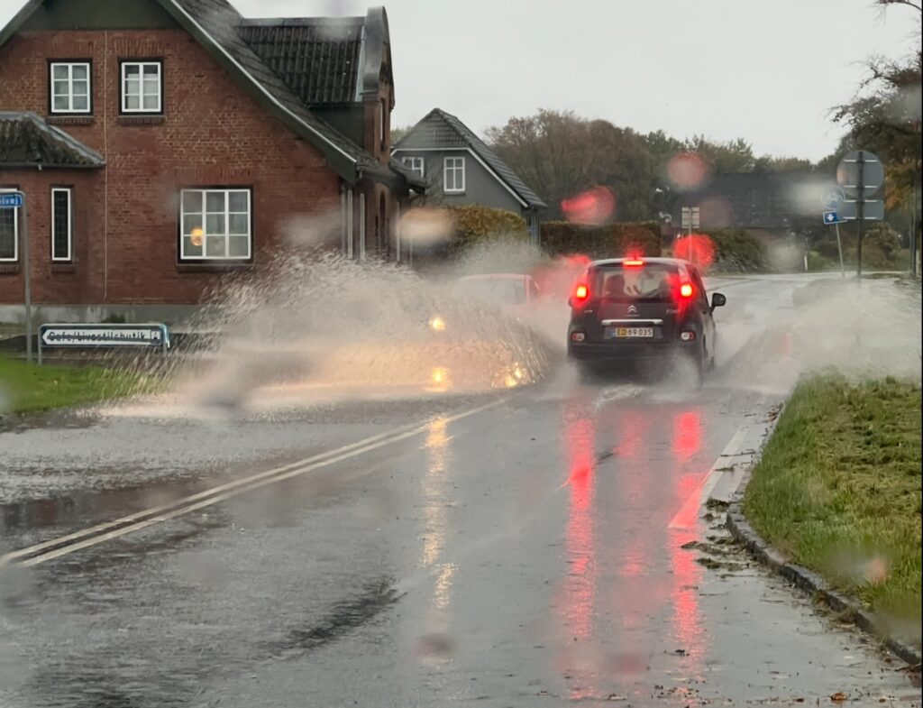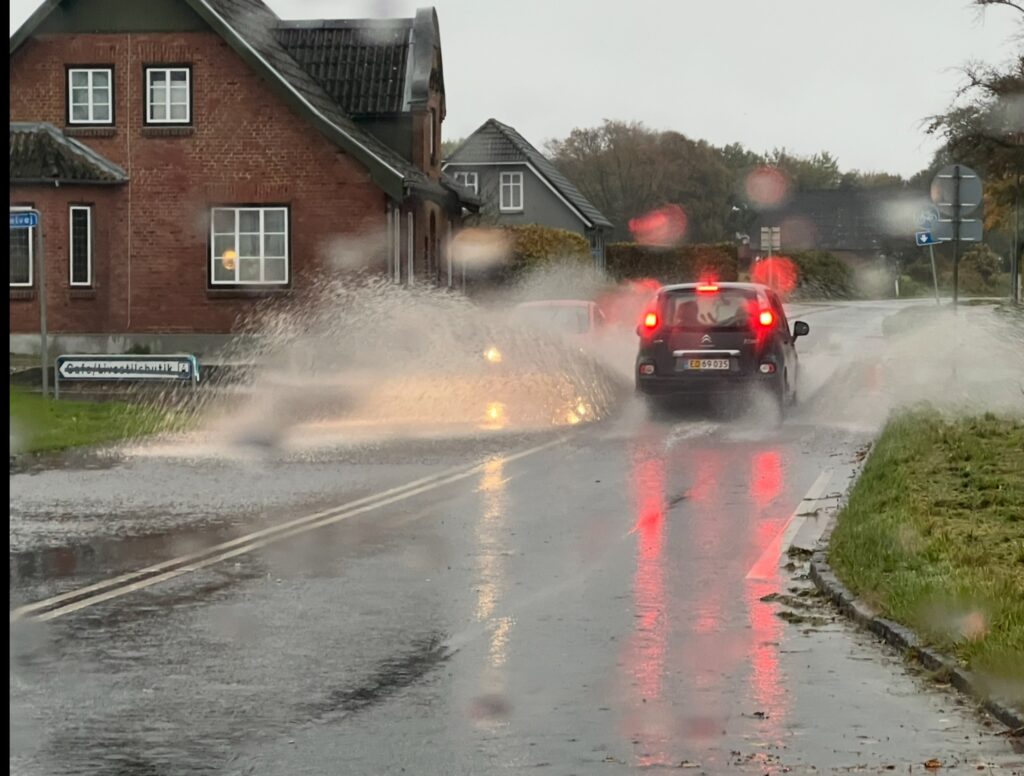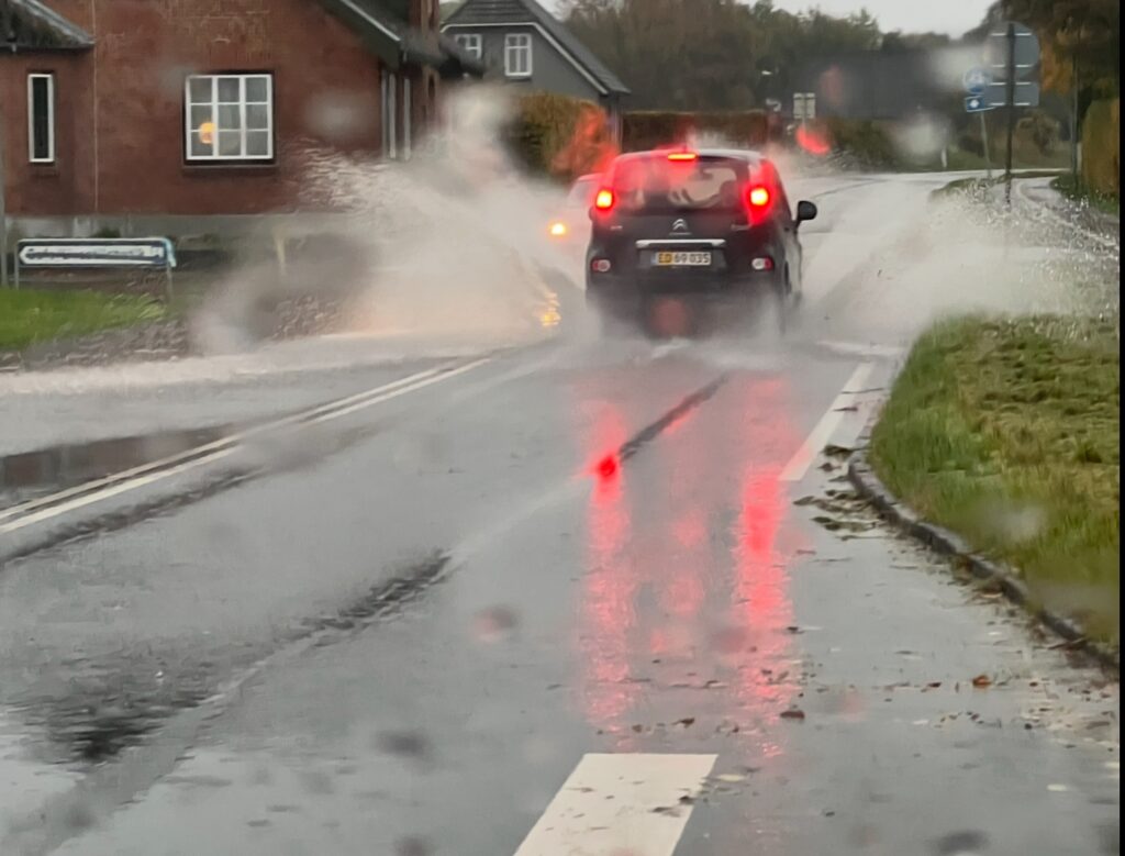 Ifølge oplysninger til Presse-fotos.dk ligger der omkring 20 centimeter vand på vejbanen, og trafikanter opfordres til at køre forsigtigt gennem området.