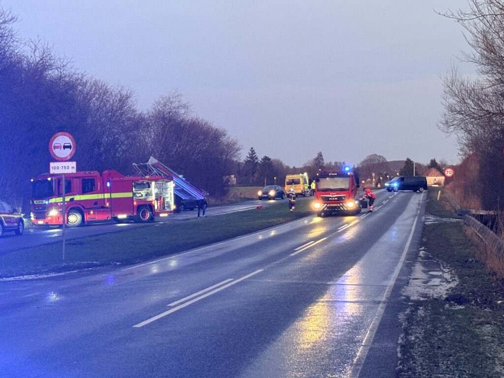 Politi, brandvæsen og ambulance er fremme ved ulykkesstedet, hvor vejen er blevet delvist spærret, mens oprydningsarbejdet står på.