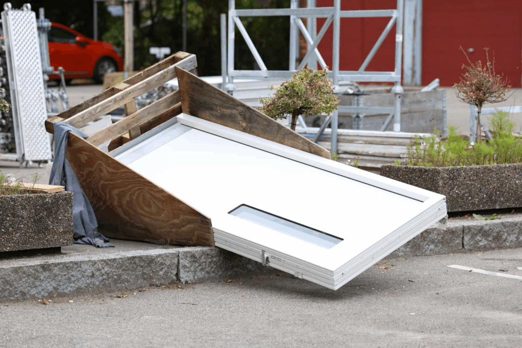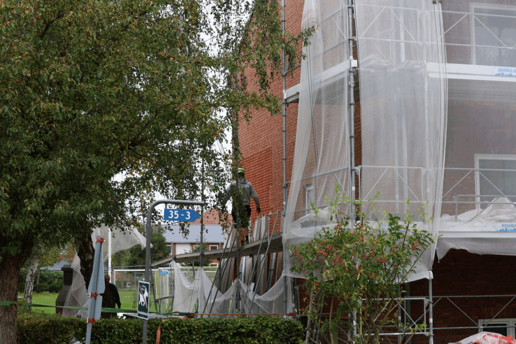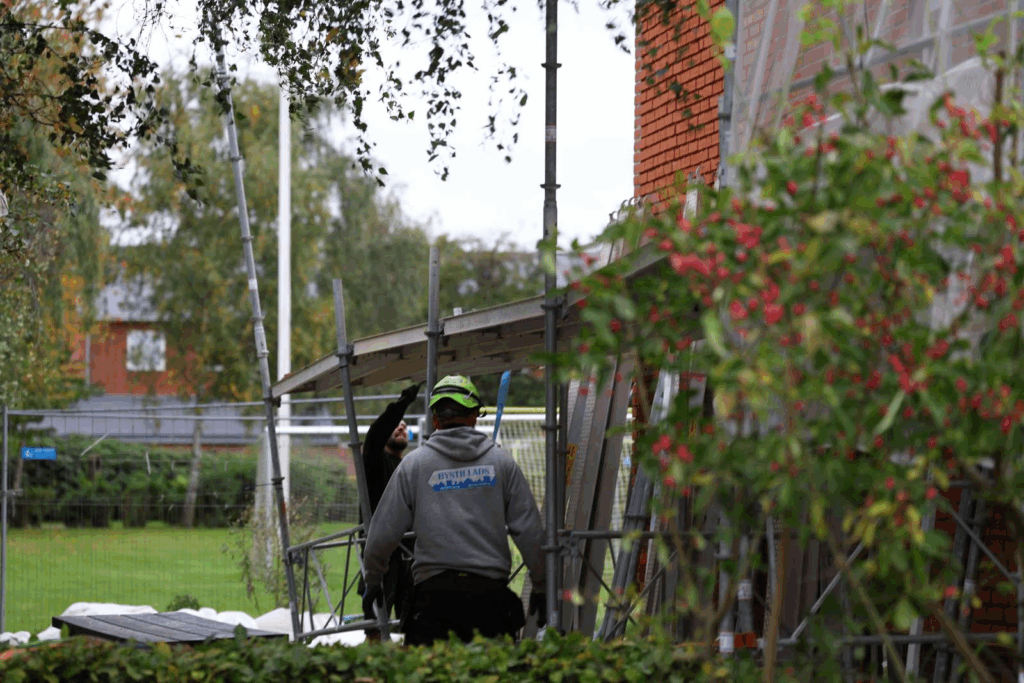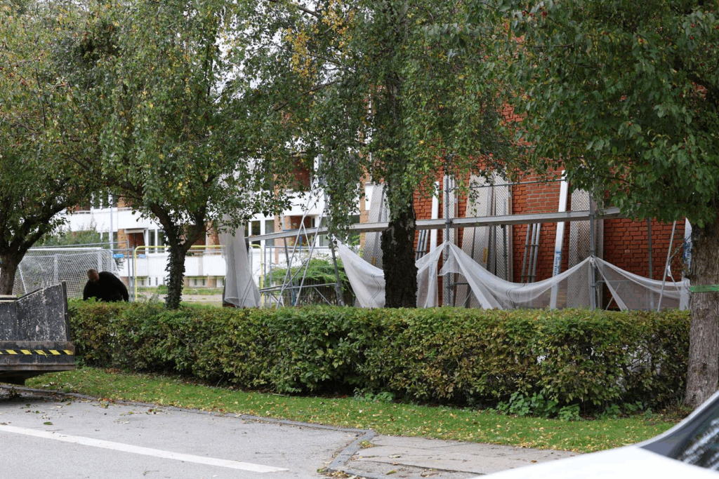 Et stillads på seks meter er væltet ned i et træ på grund af blæst på vejen Vadbro i Søborg.