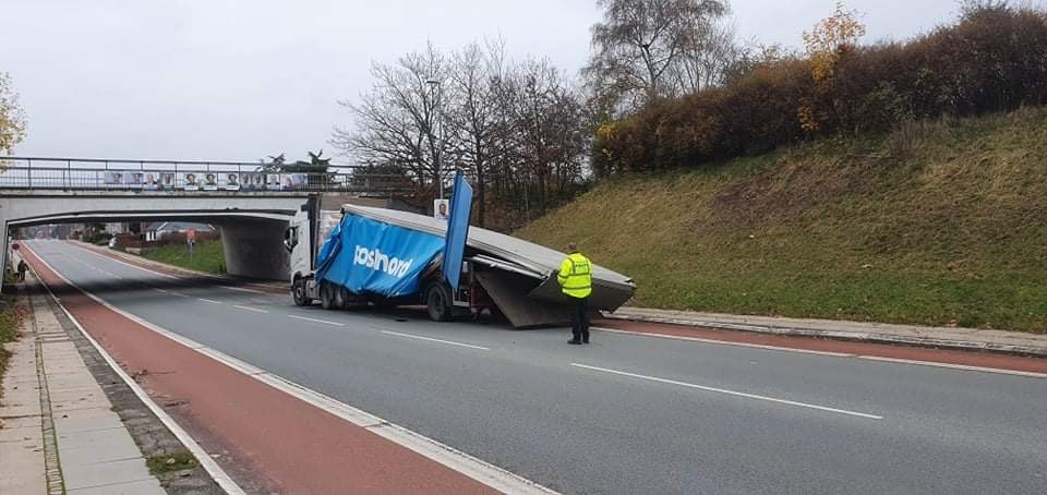 En lastbil har ramt en bro på Nyborgvej ved Teglværksvej, hvilket lige nu skaber trafikale problemer i området.