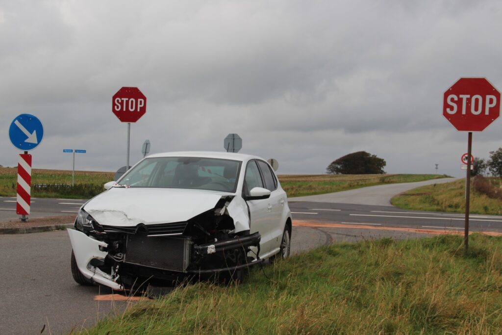 Det andet køretøj, en hvid personbil, har fået store skader på fronten.