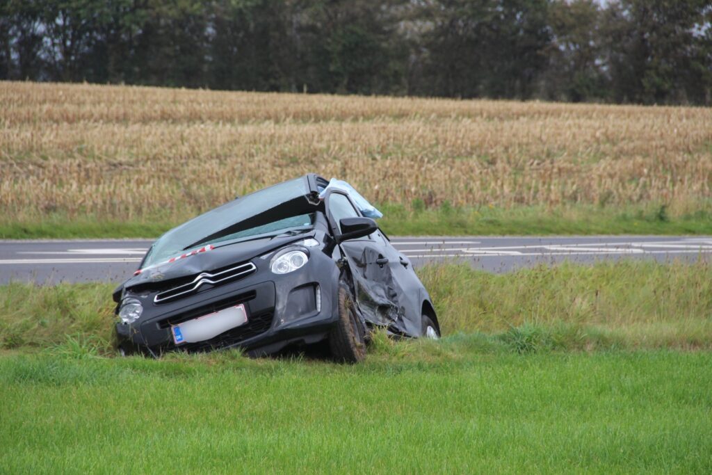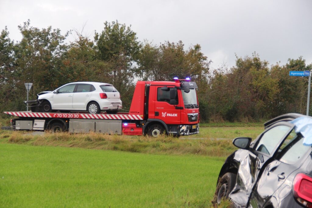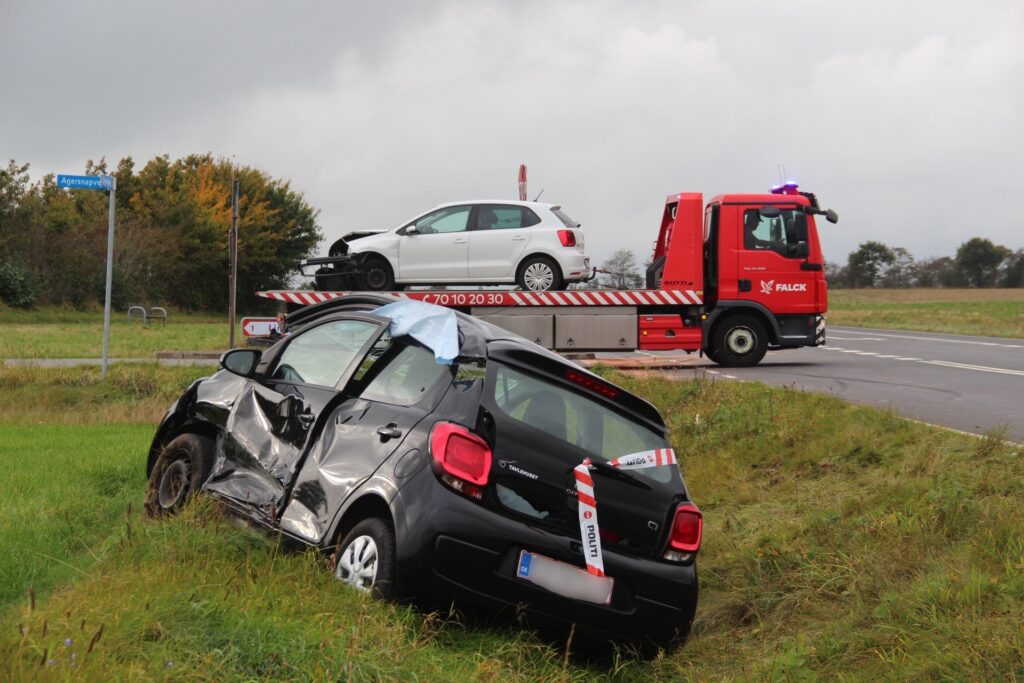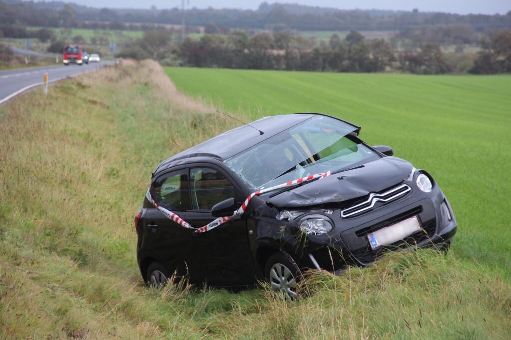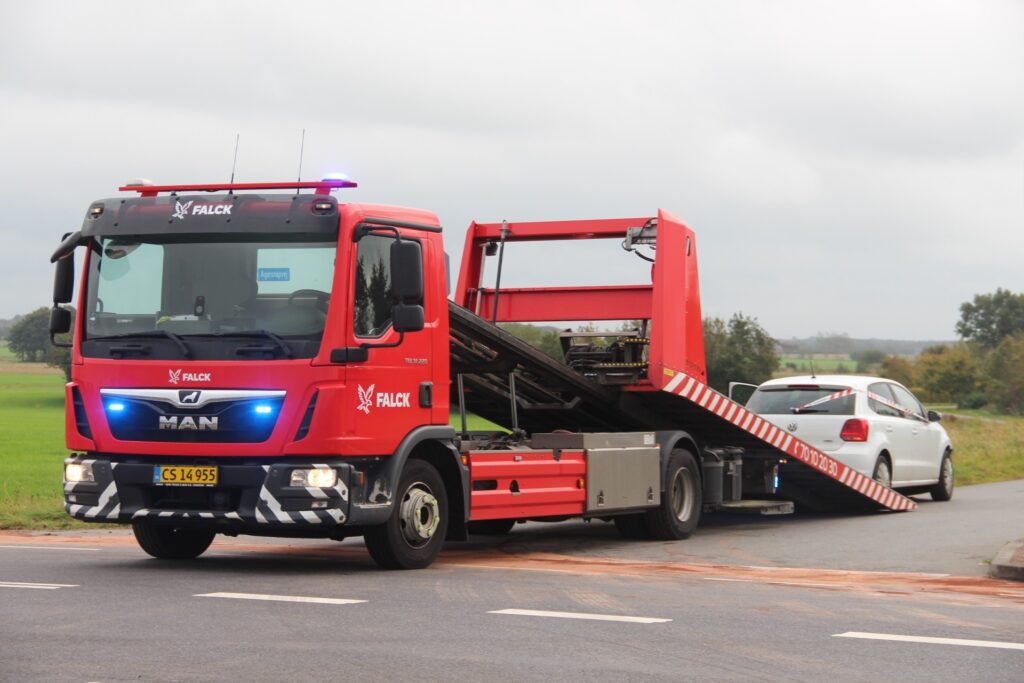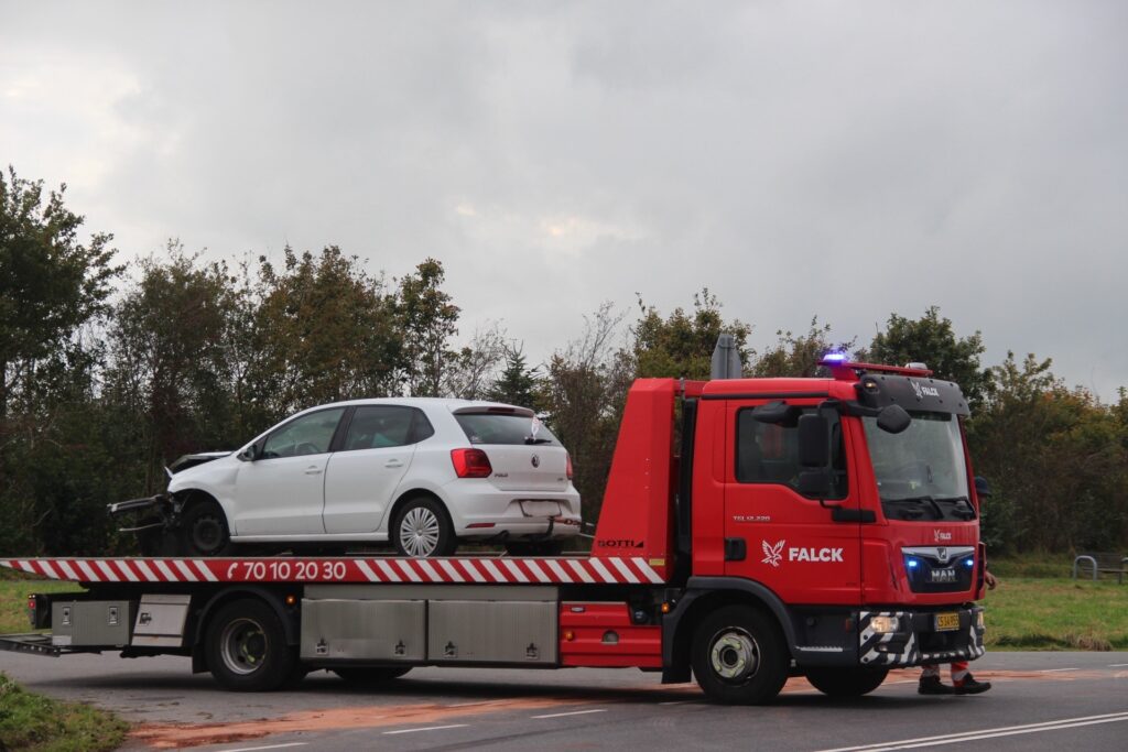 Begge køretøjer har lidt stor skade under ulykken, hvor en sort personbil er havnet i en grøft.