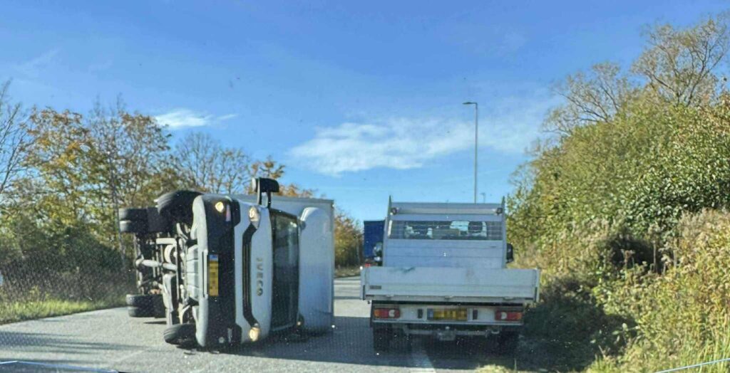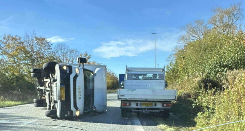 Her er en varevogn væltet på en frakørsel. Varevognen ligger nu på siden og spærrer hele vejen.
