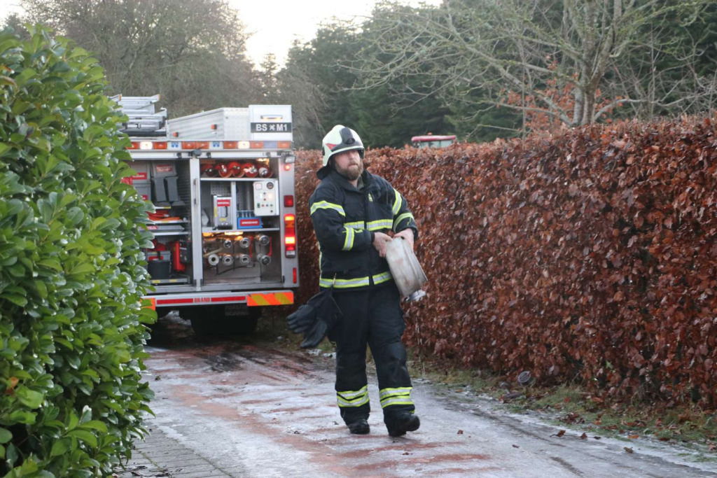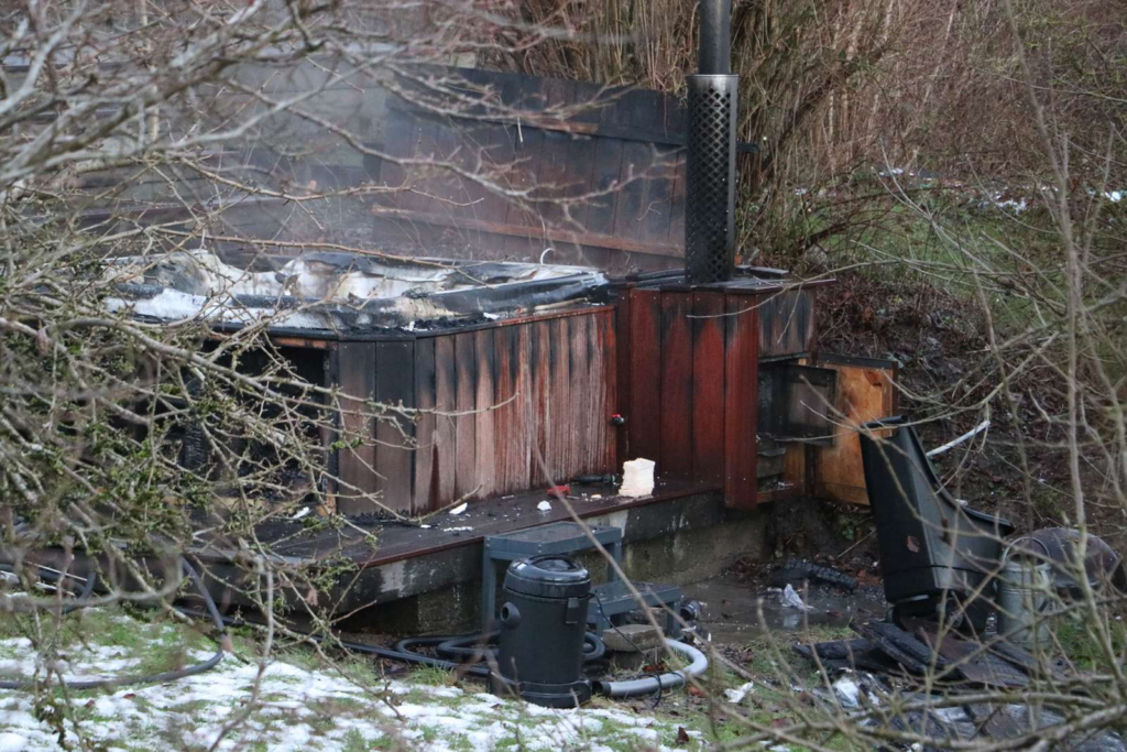 Det brændende vildmarksbad befinder indløb først som melding om brand i et fritliggende udhus eller skur, men ilden hurtigt fik fat i træet omkring badet. Brandfolk er i gang med at slukke og efterslukke, mens indsatslederen har overblik over situationen.
