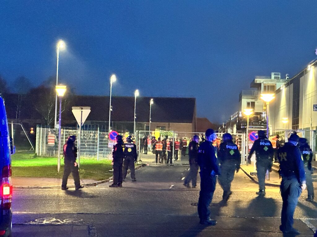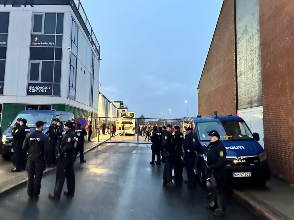 Mange betjente står klar ved stadionet, hvis der skulle opstå drama. Billederne er taget efter kampen – se flere nederst i artiklen.