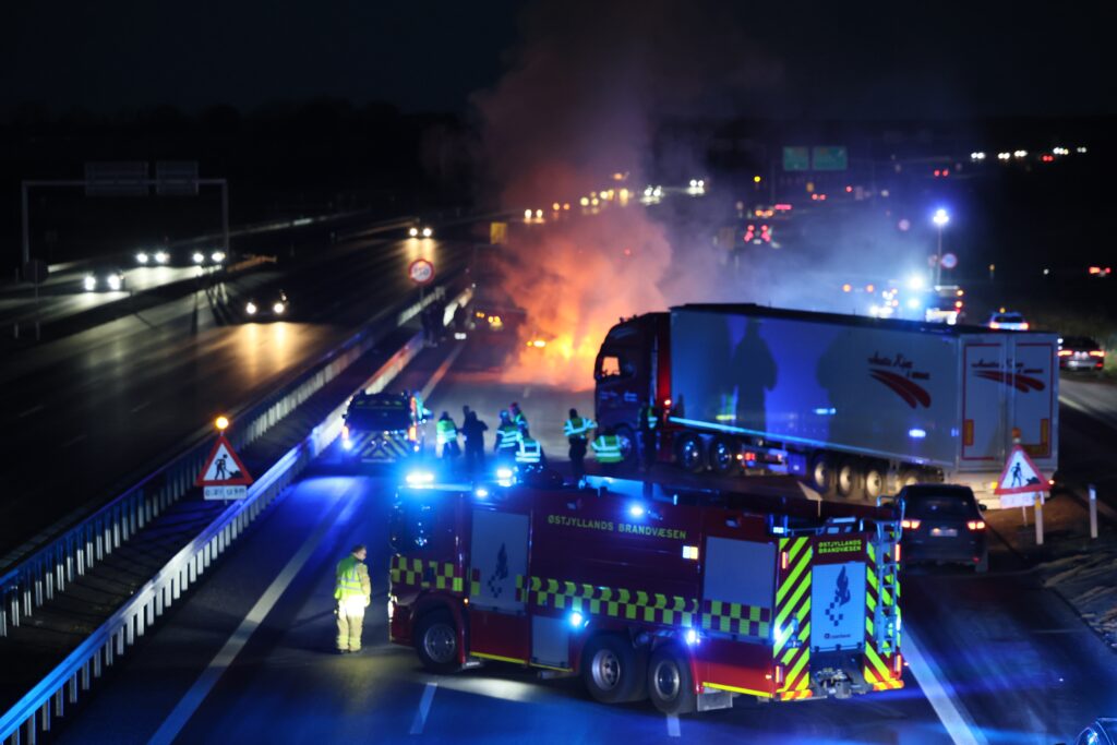 Bilen i brand holder ved E45 i nordgående retning kort før Motorvejskryds Aarhus Vest nær Harlev.