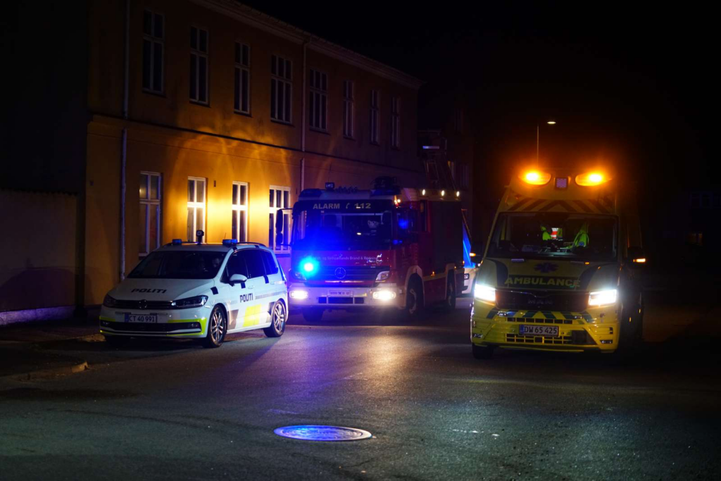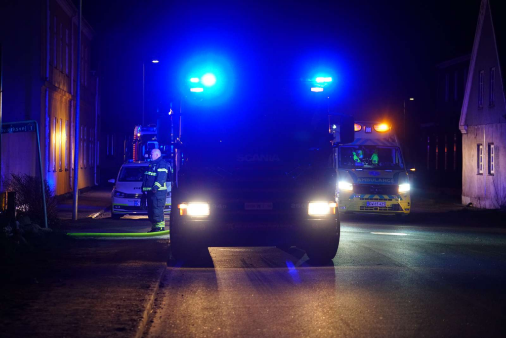 Brandvæsenet kæmper intenst mod kraftige flammer, mens politiet og ambulancepersonale overvåger indsatsen.