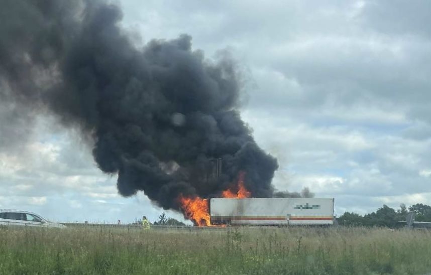 ‘Mellem 30 Støvring og 31 Støvring Syd holder der en lastbil i brand i nødsporet. Vejhjælp er på vej, men man skal være opmærksom på kø og nedsat hastighed,’
