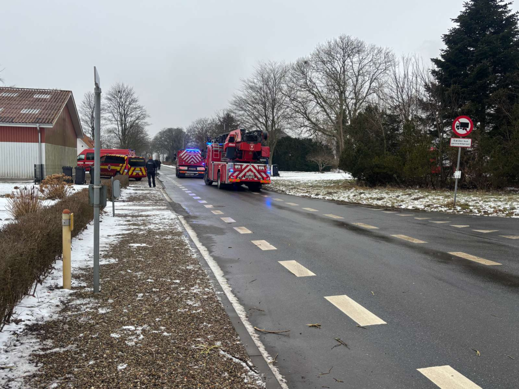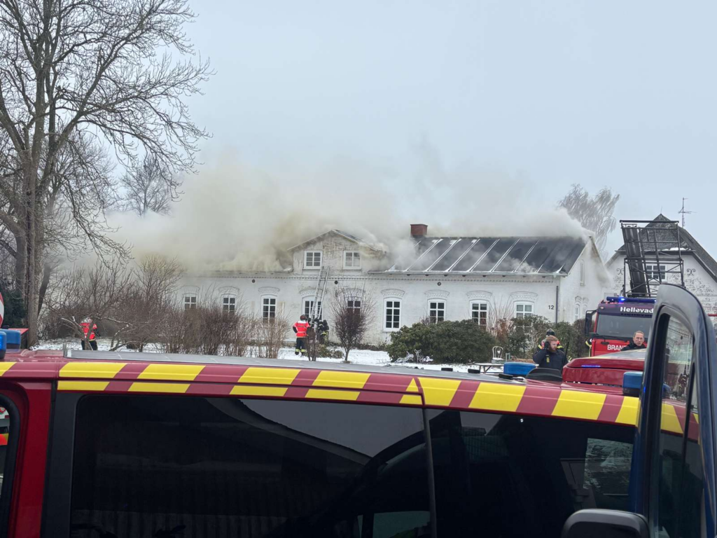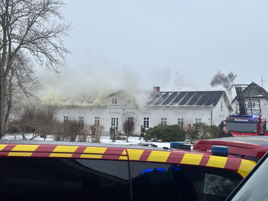 Der er tydelig aktivitet omkring ejendommen, hvor mandskab arbejder både tæt på bygningen og med at sikre området omkring brandstedet.