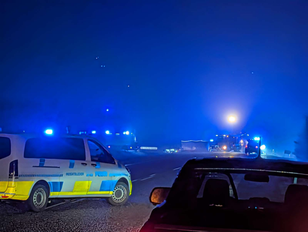Billeder fra stedet viser kegler og udrykningskøretøjer, der spærrer vejen i begge retninger. I midten af afspærringen arbejder mandskabet.