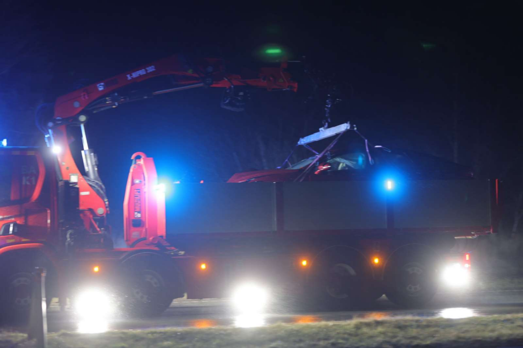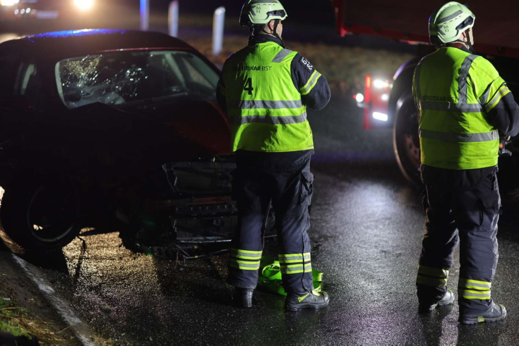Billeder fra stedet viser, at personbilen er meget kraftigt beskadiget. Fronten af bilen er helt knust, og der ligger dele af bilen spredt ud på vejen.
