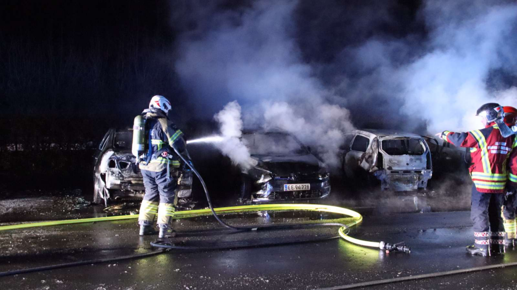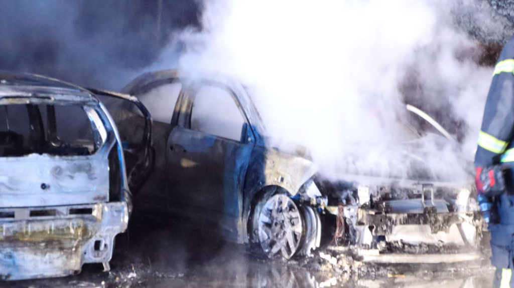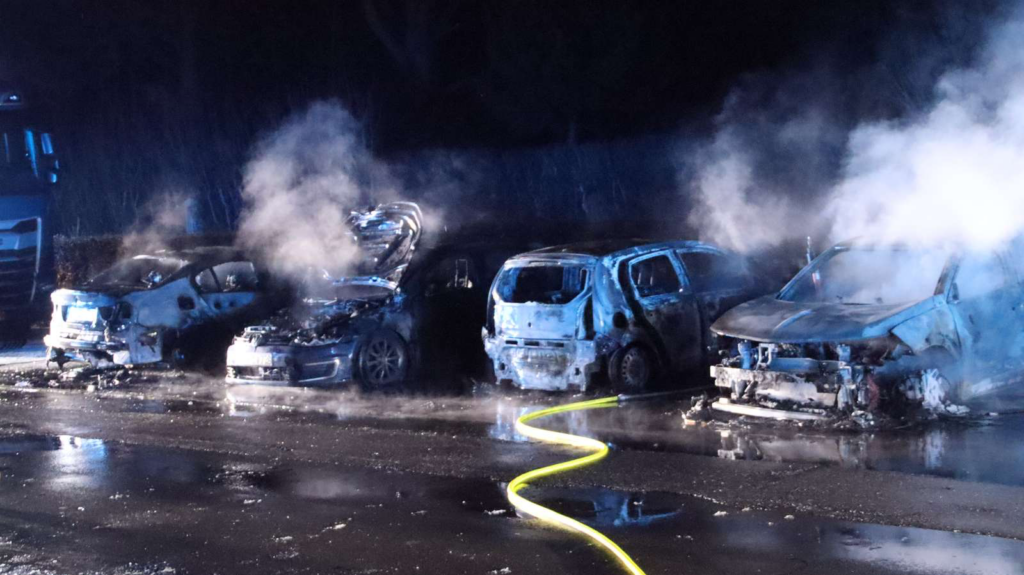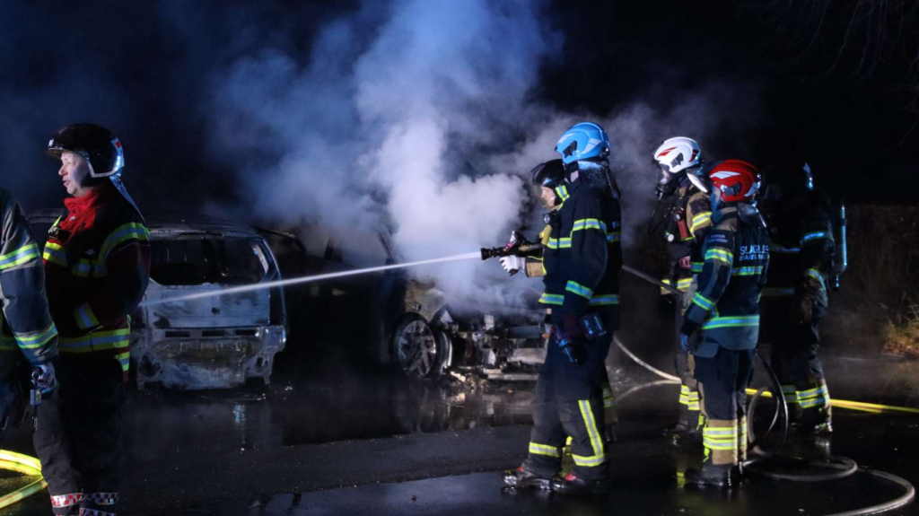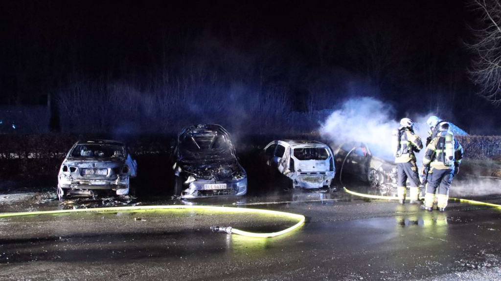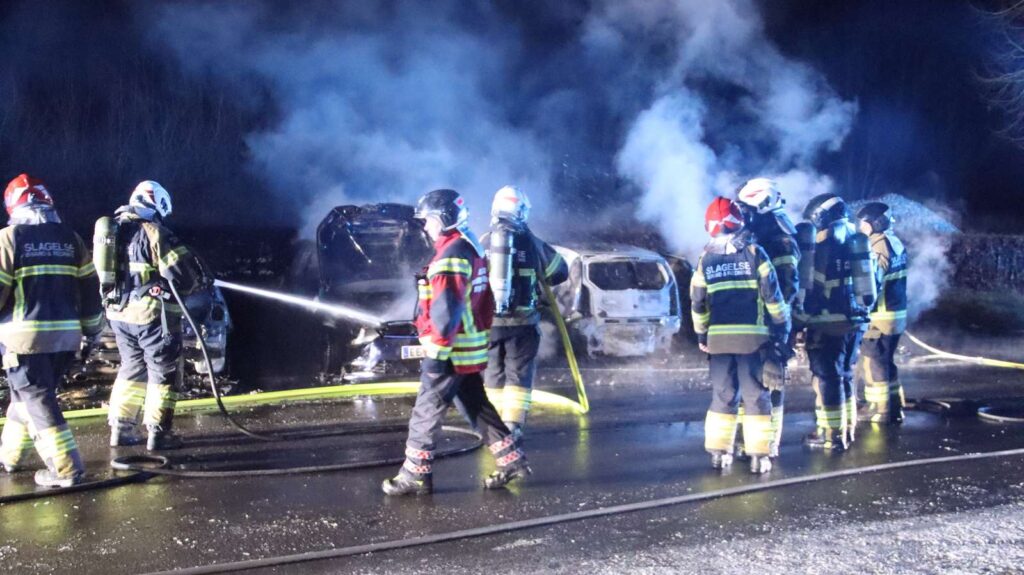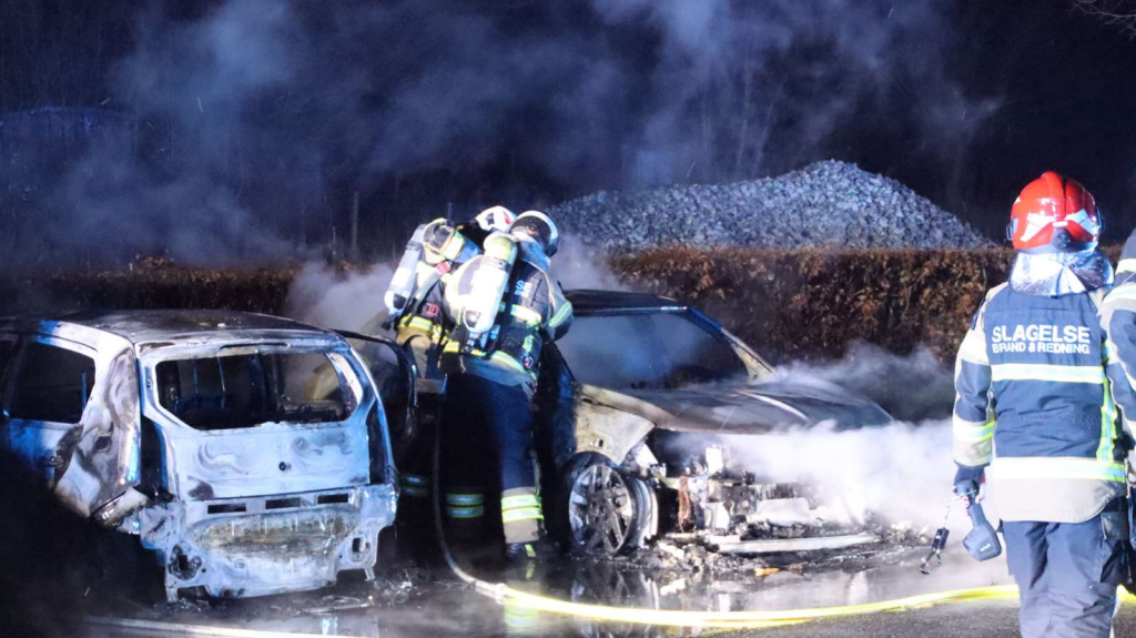 Billeder fra hændelsen viser, at bilerne er totalt udbrændte. Ruderne er sprængte, dækkene brændt, og køretøjerne er helt ødelagte.