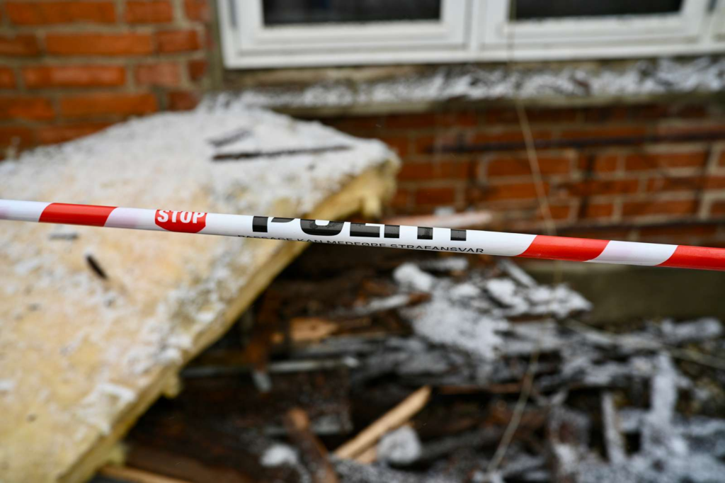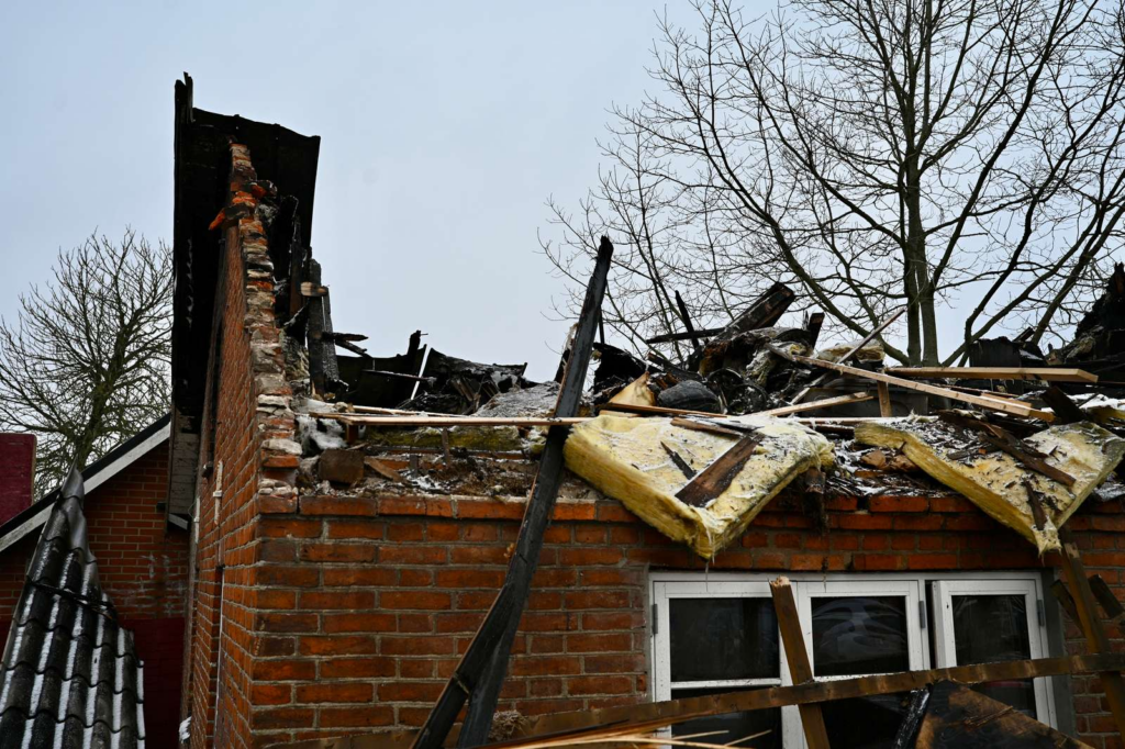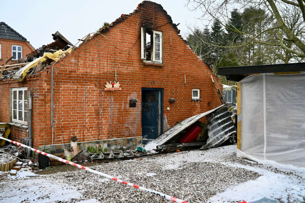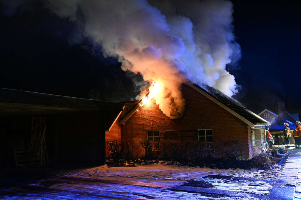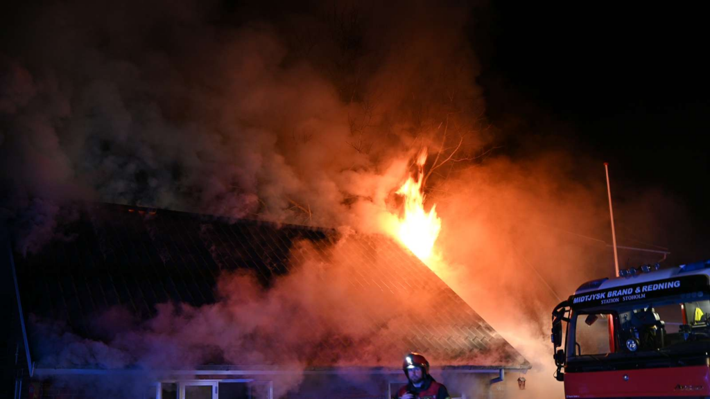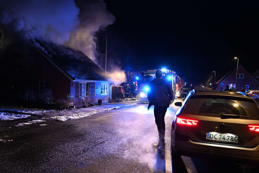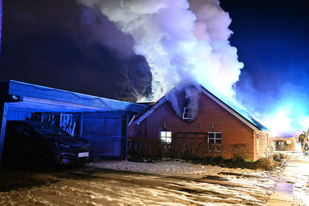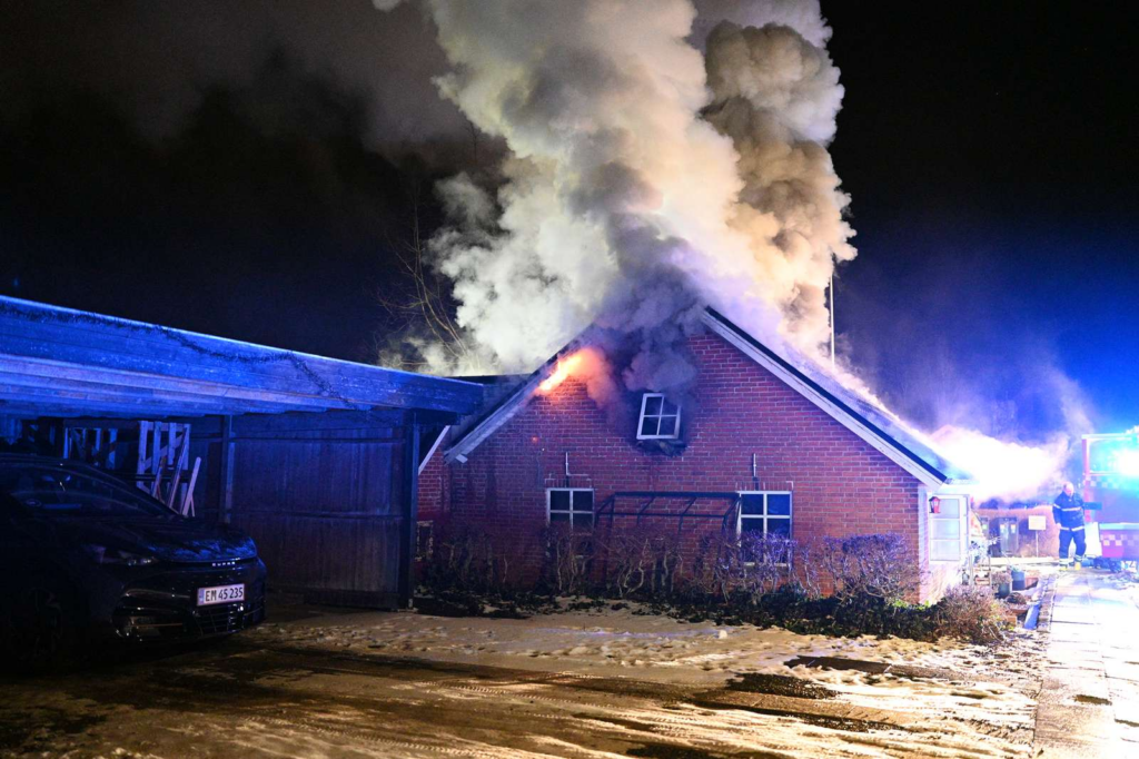 Flammerne har fået godt fat i huset, og en kraftig røgsøjle rejser sig over området.