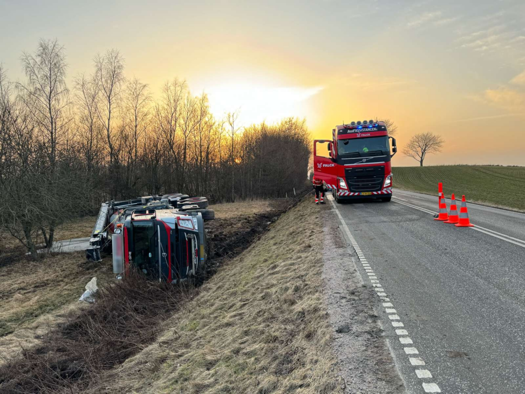 Et voldsomt færdseluheld med en stor lastbil er sket på en landevej. Lastbilen har pløjet et stort stykke græs op og er bagefter styrtet i grøften