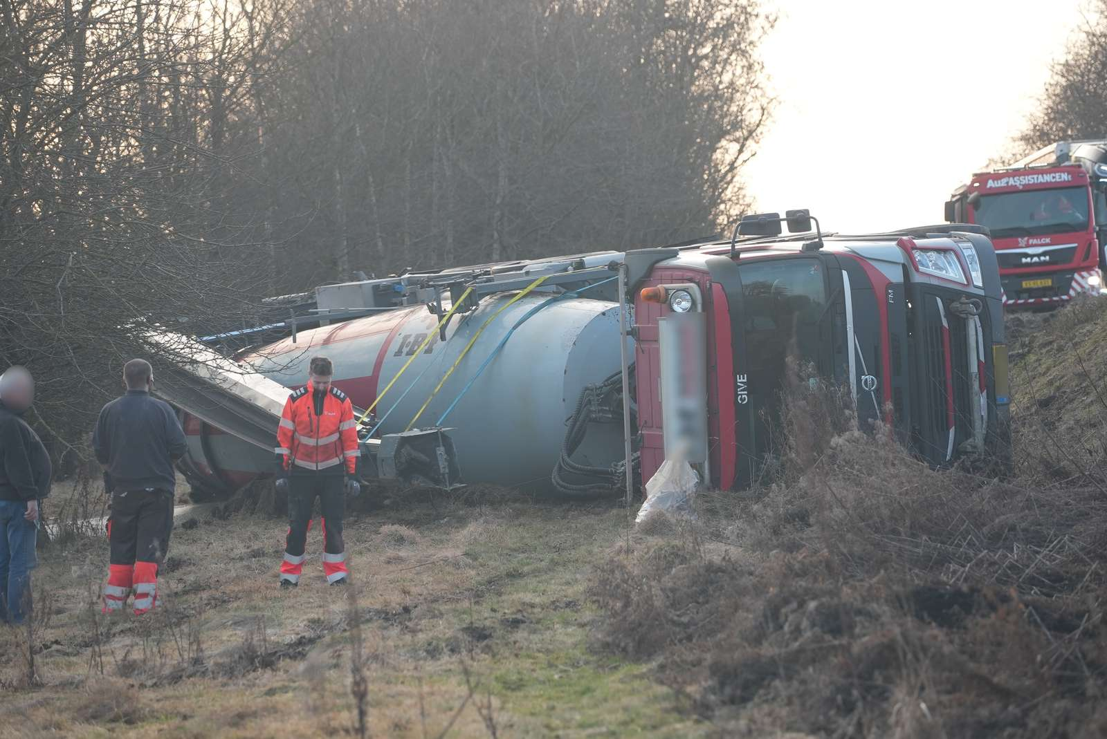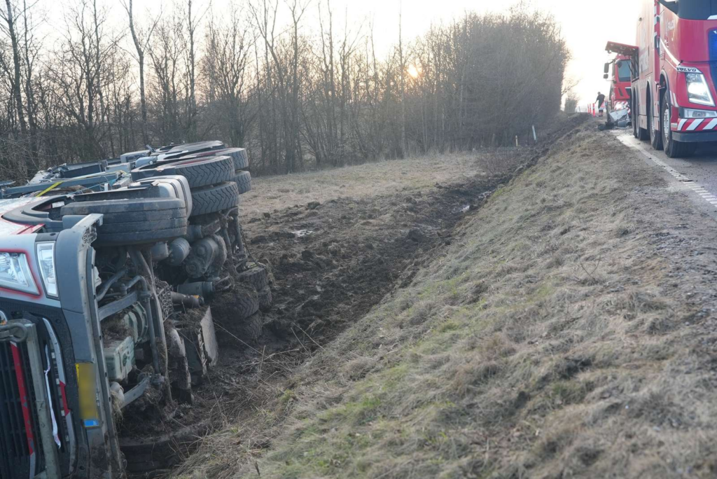 På billederne fremgår det, at lastbilen er endt med at ligge på siden – nu med bjærgningskøretøjer omkring sig.
