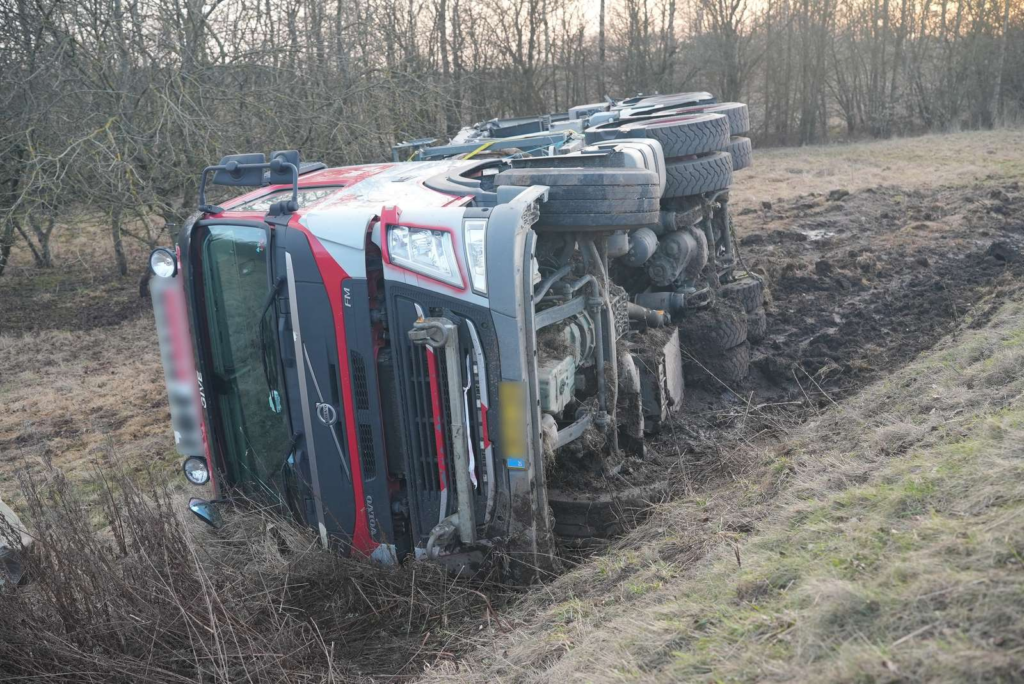 En tonstung betonvogn er kommet kørende langs landevejen og er pludselig af ukendte årsager kørt dybt ned i en grøft, hvor den har pløjet et større græsstykke op for derefter at styrte i jorden.