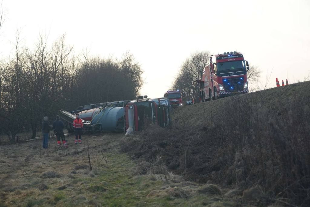 “Lastbilen ligger på siden nede ad en skråning fra landevejen. Det ene vejsport er afspærret, og Falck er her med et bjærgningskøretøj,” siger Presse-fotos.dks udsendte.