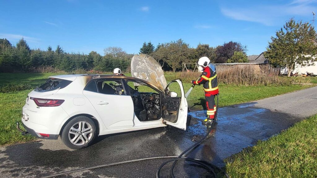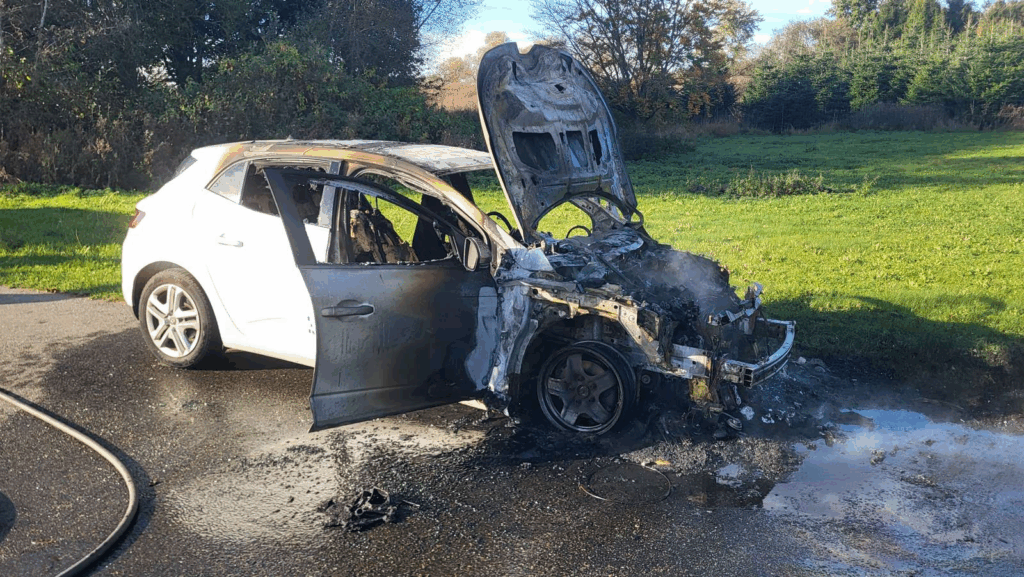En bilbrand fik søndag formiddag brandvæsnet til at rykke ud til en vej, hvor en bil nu står tilbage med store brandskader.