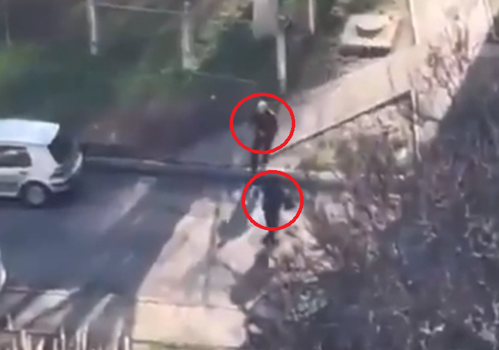 Derefter løber han mod en kvinde, der går ude på vejen. Kvinden hejser hænderne op mod ham, men han retter riflen mod hendes hoved og skyder.