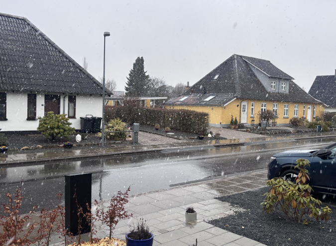 “Det er sådan noget vejr man ønsker sig i december-måned, men når man har brugt de sidste par dage i haven, på at køre robotplæneklipperen i stillin og fundet havemøblerne frem, så er det da lidt træls med sne nu.”