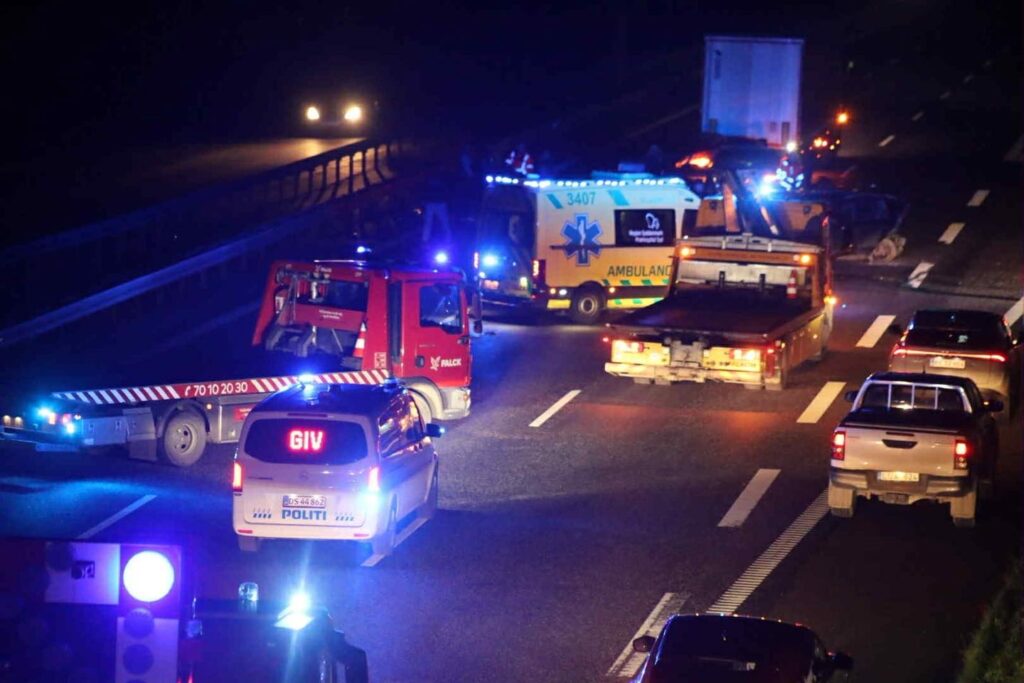 Voldsomt uheld: Fire personbiler og en lastbil brager sammen på motorvej