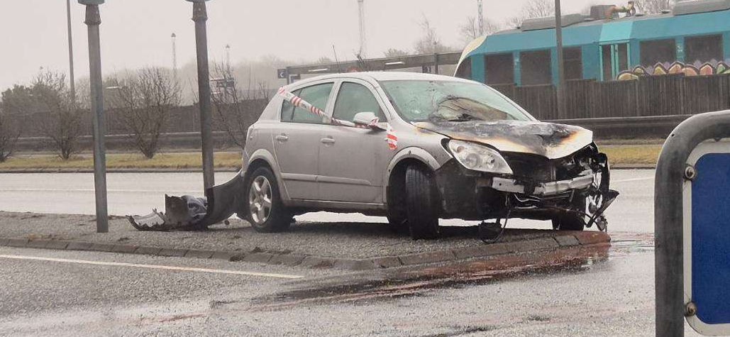 Politiet er umiddelbart færdige på stedet, hvor trafikanter i øjeblikket kører forbi den ødelagt bil, der fortsat holder ved krydset.