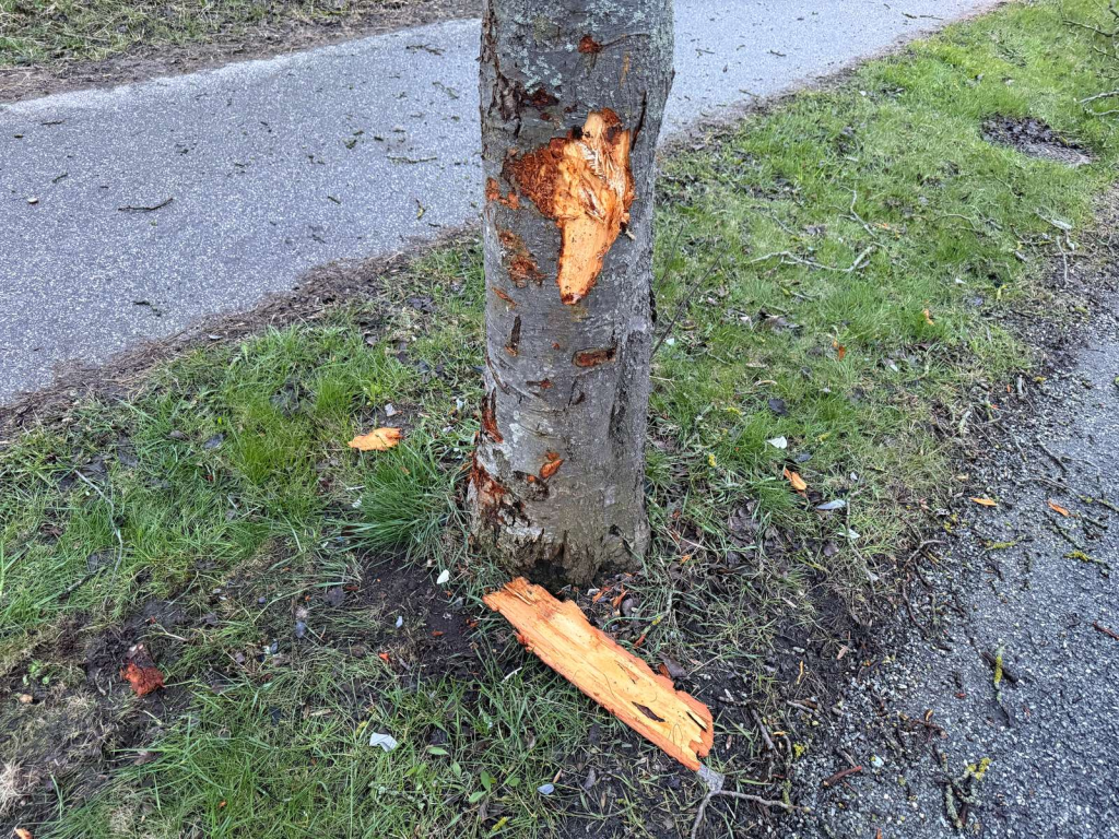 Her har et køretøj påkørt et træ.