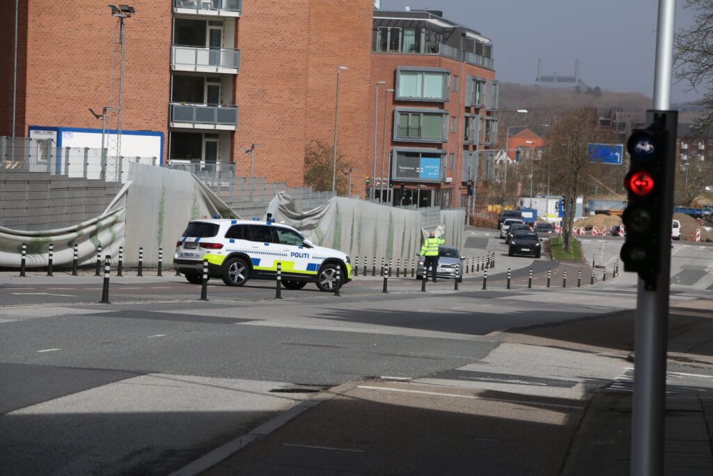 I Silkeborg melder en af vores udsendte også om, at politiet har spærret en stor vej af på grund af farer for et stillads på noget nybyggeri vælter ned over vejen.
