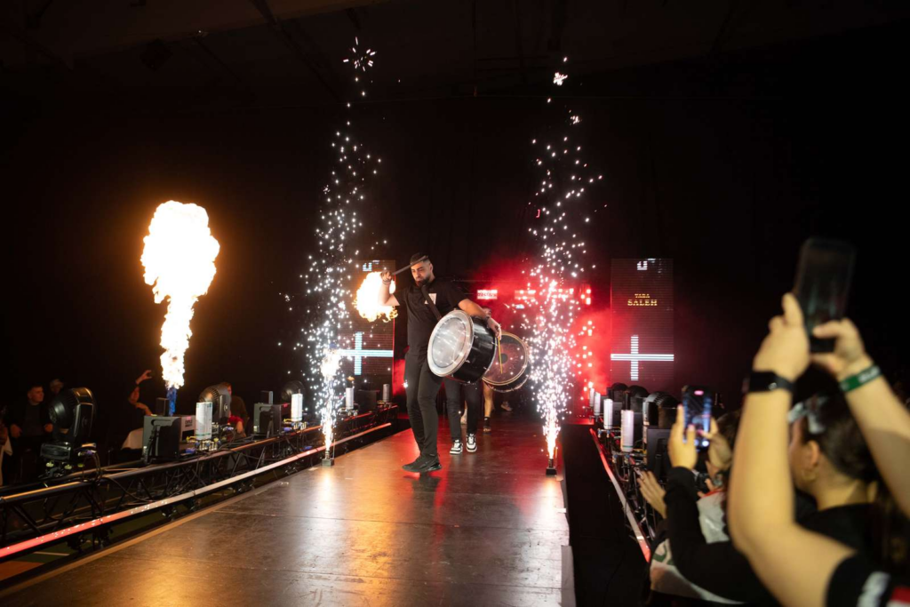 Yaras ankom til hallen iført det traditionelle Mongkol-pandebånd og flankeret af stortrommer, der rungede ud i hele hallen.